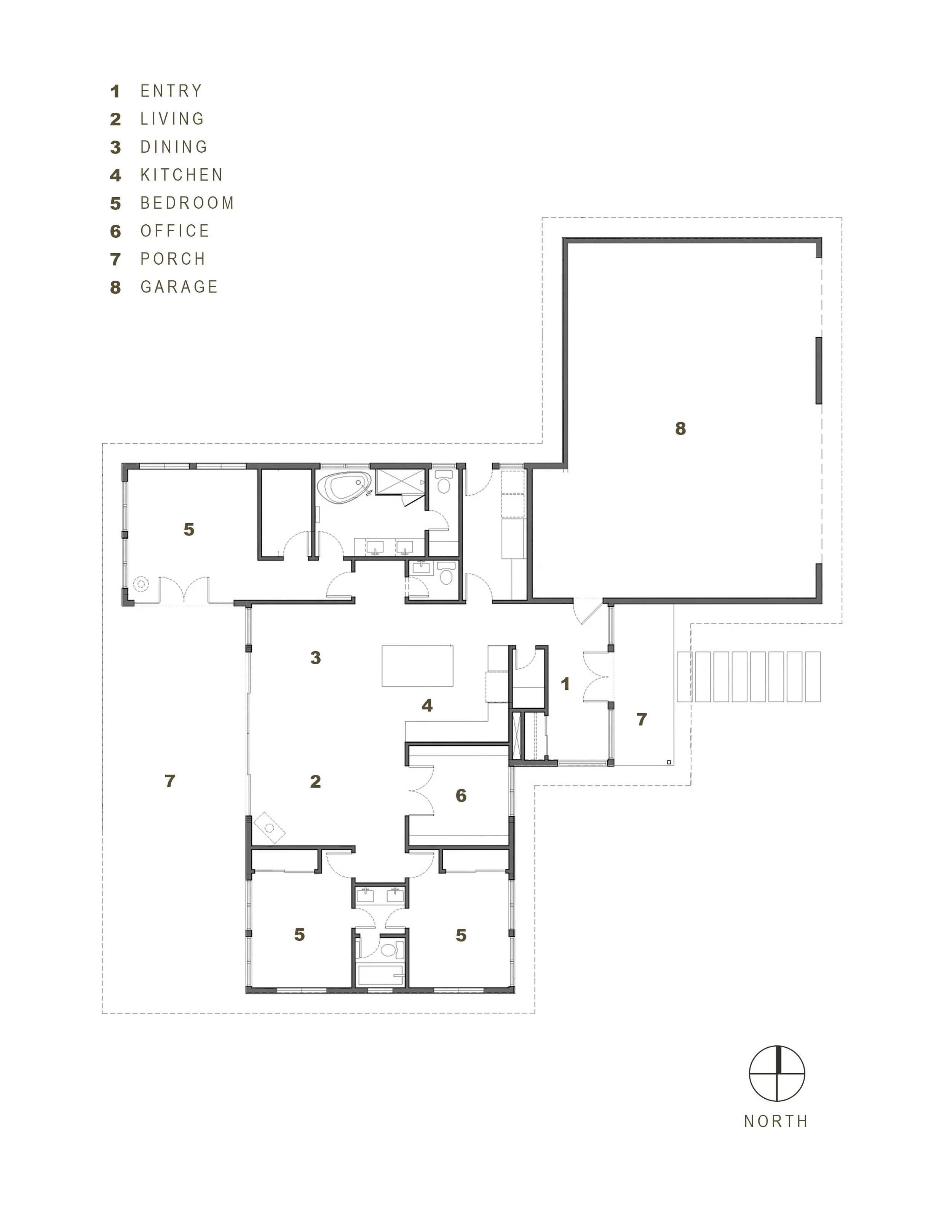 Green Sage Residence is located in the southern plains of Colorado with a stunning Rocky Mountain Backdrop, and serves as a modern cabin for a growing homesteading family. Cost efficiency, a small footprint on the landscape positioned to maximize energy efficiency, and a garage that would accommodate a sailboat, yet remain proportionally cohesive, were a few key priorities that would influence the design. Exposed exterior structure is a nod to the traditional mountain cabin, while crisp white interiors and large windows maximize natural light and openness to the vast landscape. A deep southwest overhang protects the main glass façade from peak summer temperatures while allowing for ample winter sunlight to penetrate deep into the space. Similarly, polished concrete floors retain and release heat in winter months and remain cool to the touch during hot, exposed summers.